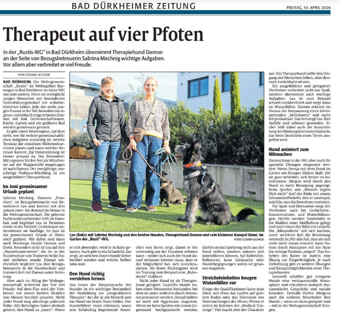 In der Rustis‑WG in Bad Dürkheim spielt Therapiehund Damon eine besondere Rolle. Gemeinsam mit Bezugsbetreuerin Sabrina Mechnig unterstützt er die Bewohnerinnen im Alltag, sorgt für Struktur, Nähe und viele positive Momente.